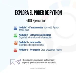 Si te resultó útil en el siguiente artículo vs a encontrar más ejercicios de Python. Este recorrido progresivo en 4 módulos te llevan desde los fundamentos hasta proyectos avanzados. Cada bloque de 100 ejercicios está seleccionado y mejorado por BeActual para que aprendas paso a paso, con ejemplos claros y aplicables. Con esta estructura modular, podrás avanzar a tu ritmo, reforzar lo aprendido y aplicar Python en contextos reales como ciencia de datos, automatización e inteligencia artificial.