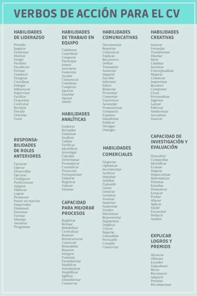 Los verbos de acción transmiten energía, liderazgo y resultados. Al utilizarlos, conviertes tus experiencias en logros tangibles y demuestras tu capacidad de generar impacto.